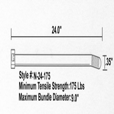 Item: N-24-175 -    The N-24-175 heavy duty premium nylon cable tie is 24 inches long, has a 175 lb minimum tensile strength, is U.L. recognized, meets military specifications where applicable and can bundle wires, cables or any other product up to 9 inches in diameter. This tie comes in natural color and is packed 50 pieces per bag and 500 pieces per carton.