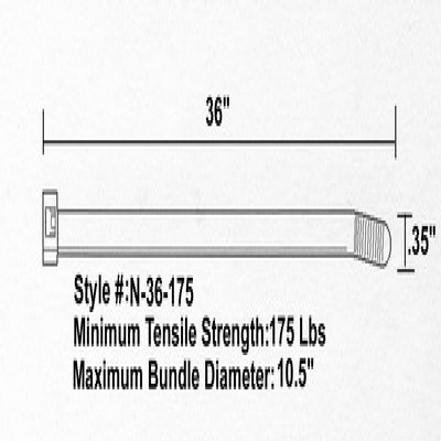 Item: N-36-175 -    The N-36-175 heavy duty pemium nylon cable tie is 36 inches long, has a 175 lb minimum tensile strength, is U.L. recognized, meets military specifications where applicable and can bundle wires, cables or any other product up to 10.5 inches in diameter. This tie comes in natural color and is packed 50 pieces per bag and 500 pieces per carton.