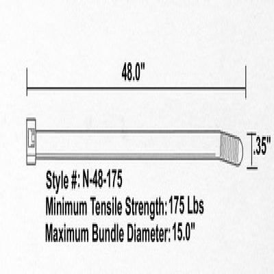 Item: N-48-175 -    The N-48-175 heavy duty premium nylon cable tie is 48 inches long, has a 175 lb minimum tensile strength, is U.L. recognized, meets military specifications where applicable and can bundle wires, cables or any other product up to 15 inches in diameter. This tie comes in natural color and is packed 50 pieces per bag and 500 pieces per carton.